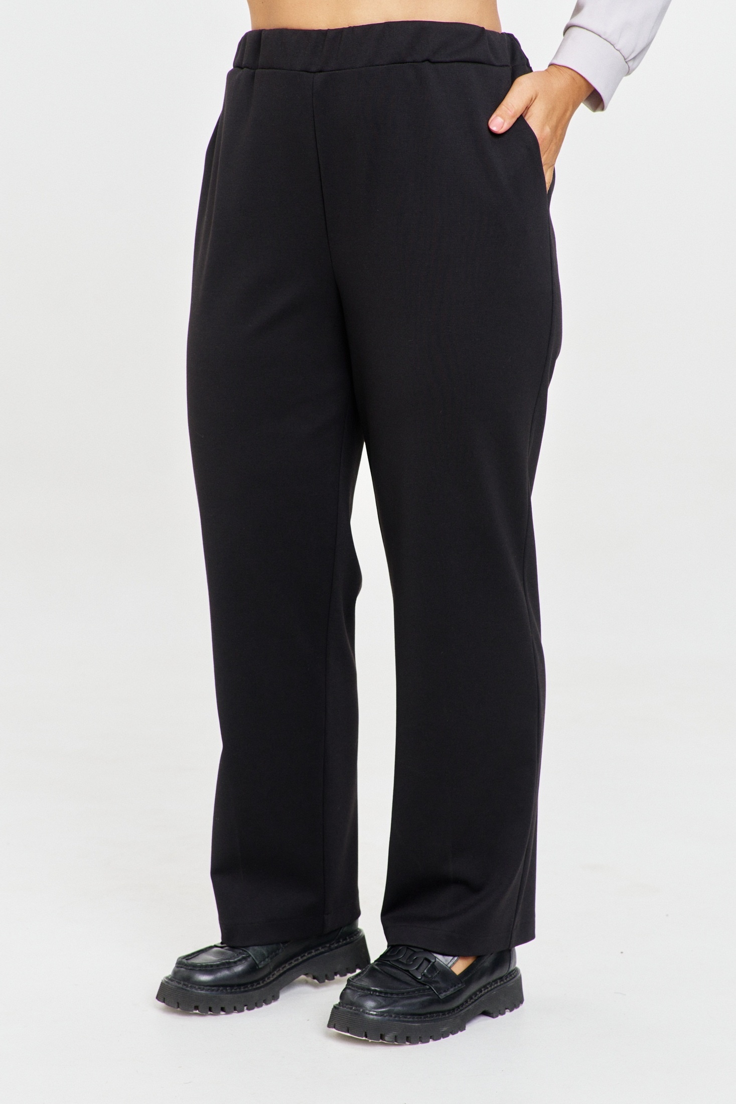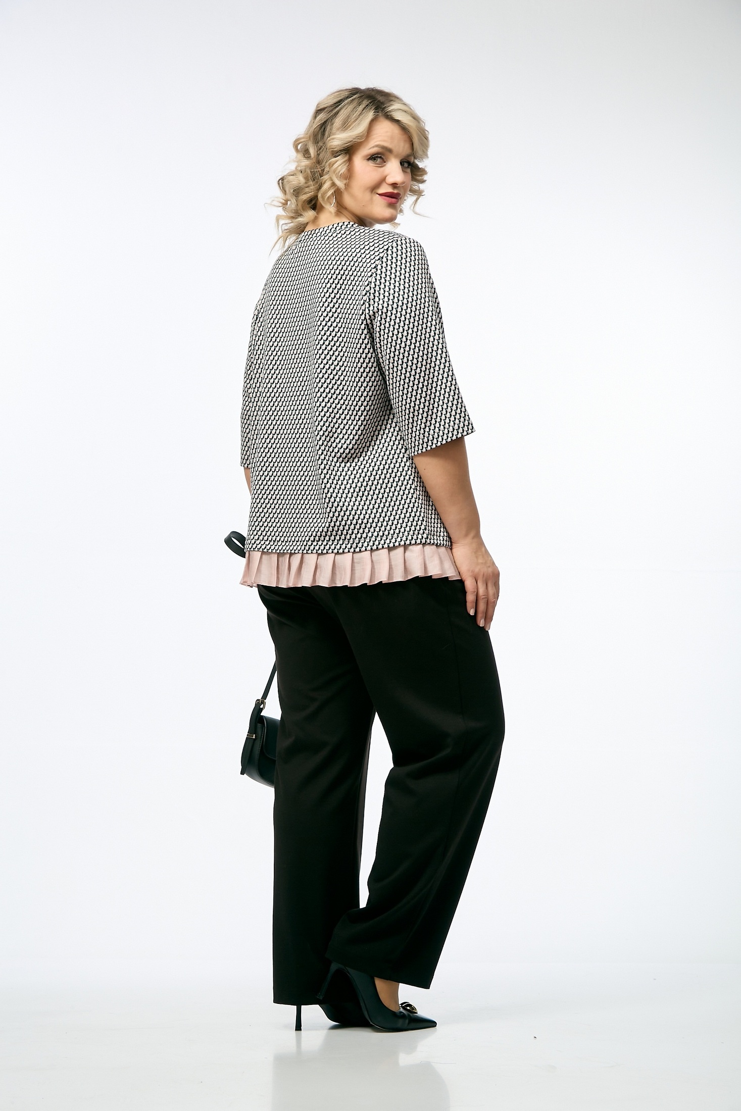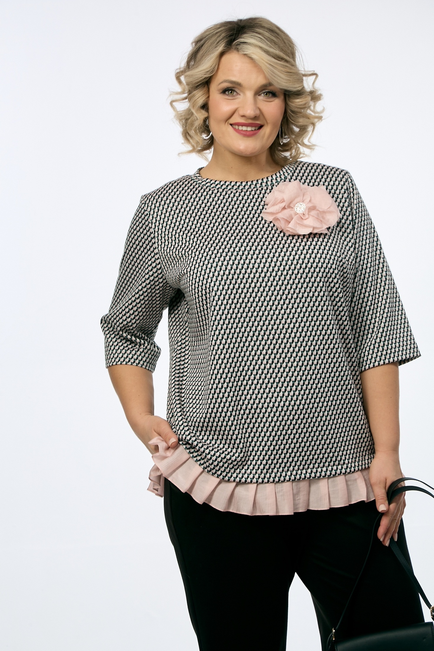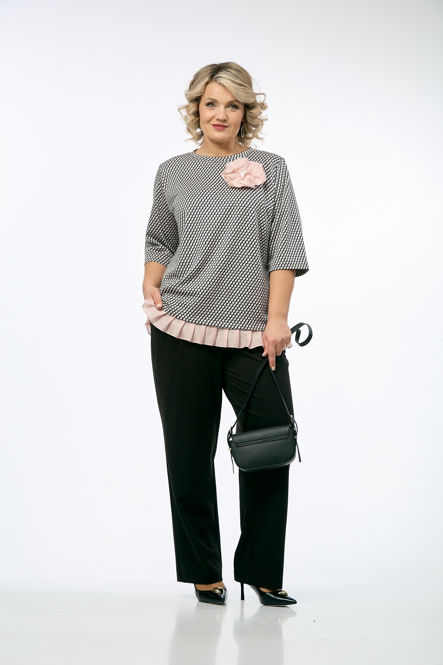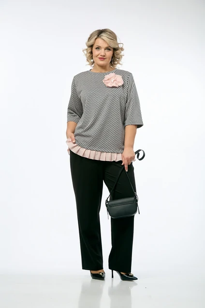 Костюм брючный 237 OVERYOU. Коллекция бренда OVERYOU предлагает стильный комплект, сочетающий в себе комфорт и элегантность. Джемпер из трикотажного жаккарда с геометрическим узором свободного кроя и контрастной отделкой подчеркнет индивидуальность и добавит образу изюминку. Широкие рукава и съемная брошь «роза» из полупрозрачной ткани станет выразительным акцентом. Брюки прямого кроя с высокой посадкой обеспечивают свободу движений и удобство в повседневной носке благодаря эластичному притачному поясу на резинке. Комплект представлен в универсальном черно-белом цвете, что делает его идеальным для офисного или повседневного стиля. Подходит для любого сезона и позволяет чувствовать себя уверенно и комфортно.