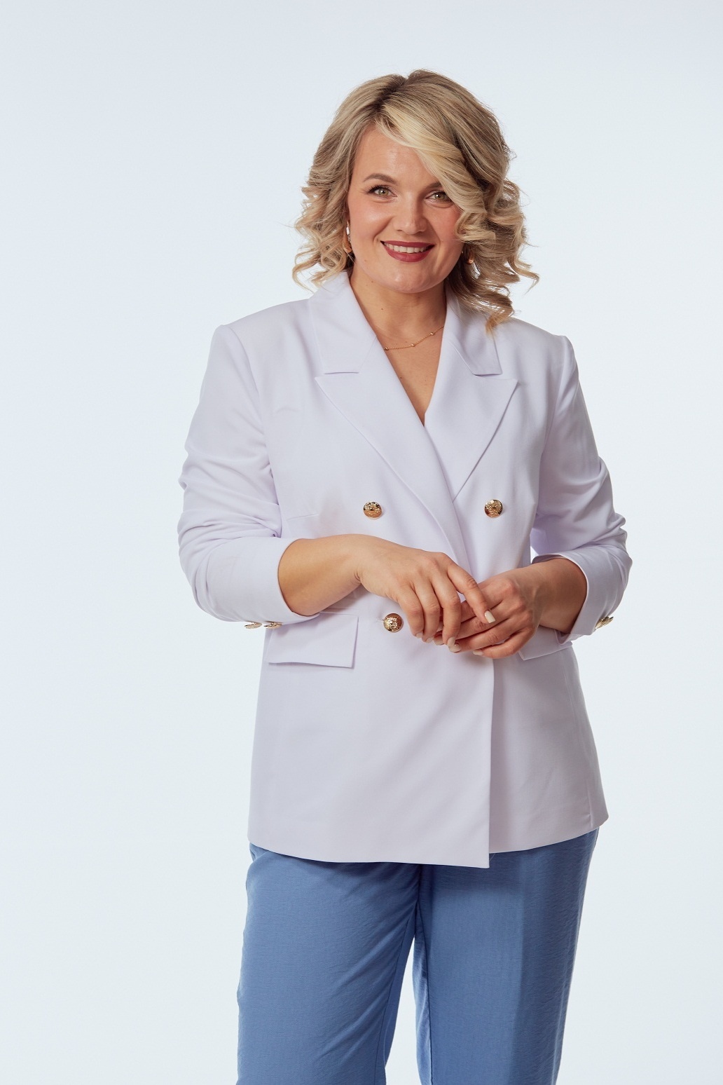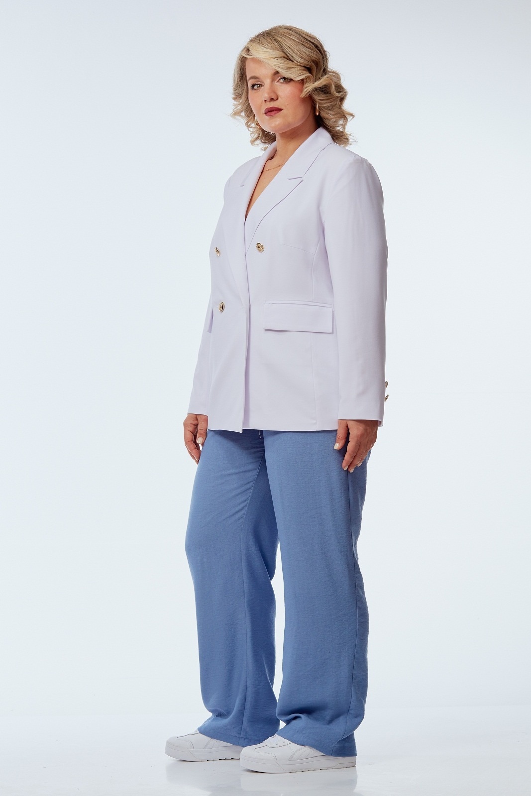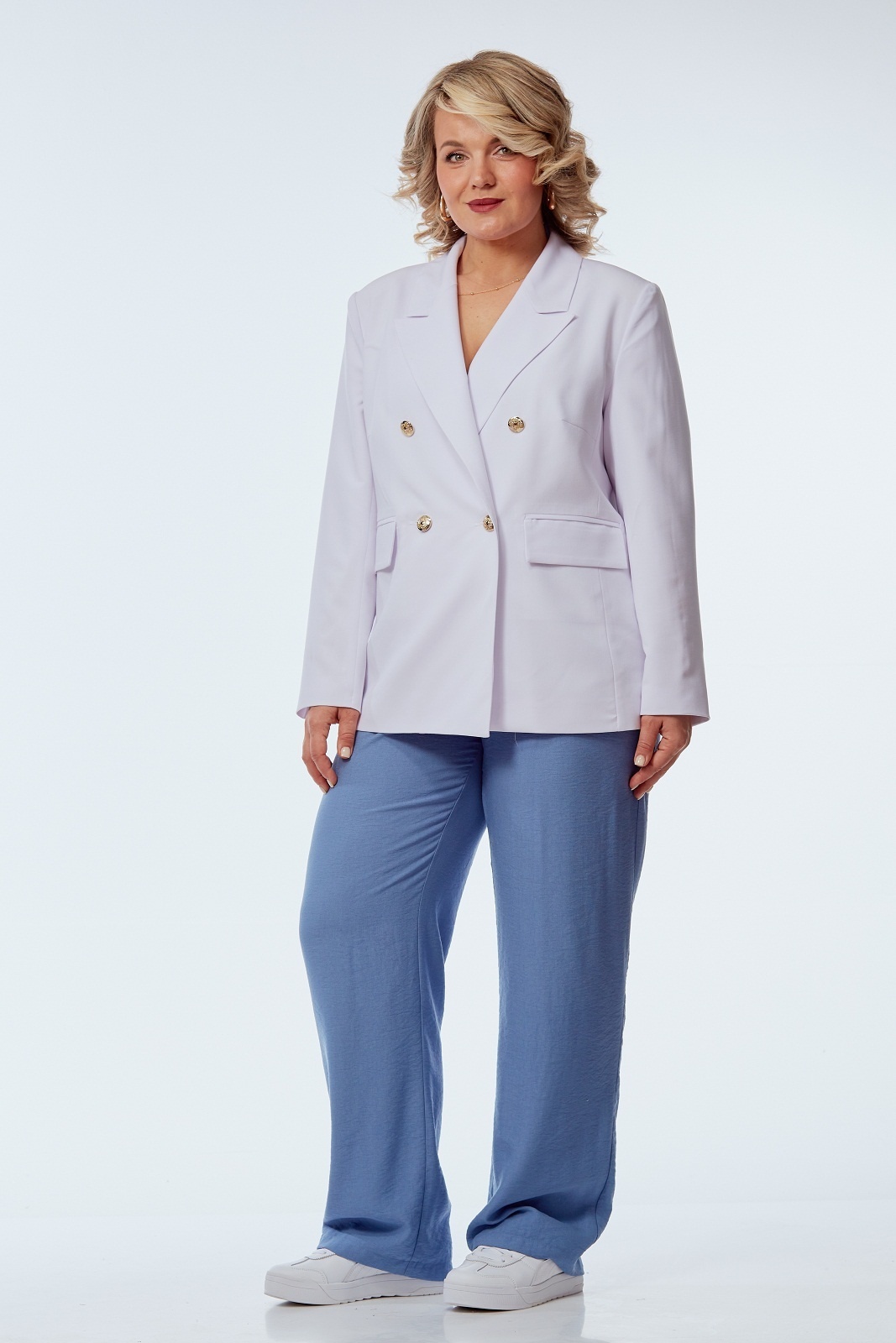 Костюм брючный 246-1 белый с голубым OVERYOU предлагает идеальное сочетание стиля и комфорта. Коллекция бренда OVERYOU представляет жакет с пиджачным воротником и широкими прямыми брюками, выполненными из смеси полиэстера и вискозы. Материал отличается эластичностью, что обеспечивает свободу движений. Двубортный жакет с декоративными золотыми пуговицами и карманами с клапанами придаёт образу практичности. Высокая посадка брюк на резинке и карманы в боковых швах создают удобный наряд для повседневности. Лёгкий и практичный костюм выполнен в классическом стиле, подходит для офиса и прогулок. Белый и голубой цвета костюма добавляют свежести и утончённости, делая его непременной частью гардероба в любое время года.