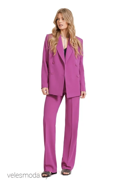 Текстильный костюм-двойка из двубортного жакета и прямых брюк со стрелками.