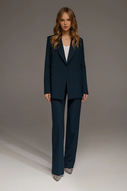 Текстильный костюм-двойка из двубортного жакета и прямых брюк со стрелками. Детали: прямой силуэт, пиджачный воротник, прорезные карманы, спинка со средним швом, втачные двухшовные рукава. Брюки с высокой посадкой на притачном поясе со шлевками, застежка на молнию и пуговицу, боковые карманы, передние половины с заутюженными стрелками и двумя небольшими складками