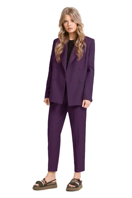 Текстильный костюм-двойка из двубортного жакета и укороченных брюк со стрелками.