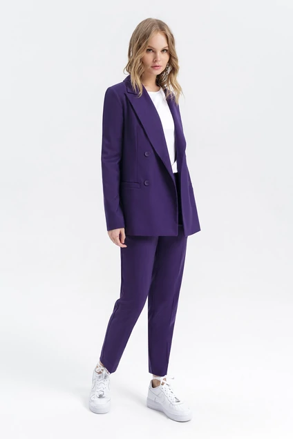 Текстильный костюм-двойка из двубортного жакета и укороченных брюк со стрелками.