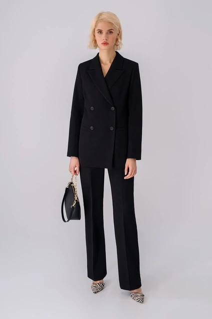 Текстильный костюм-двойка из двубортного жакета свободного покроя и прямых брюк с высокой посадкой. Детали: жакет прямого силуэта, пиджачный воротник, прорезные карманы, спинка со средним швом, втачные двухшовные рукава, жакет на подкладке. Брюки на притачном поясе со шлевками, передние половины с небольшими мягкими складками и заутюженными стрелками, застежка на молнию и пуговицу, боковые карманы