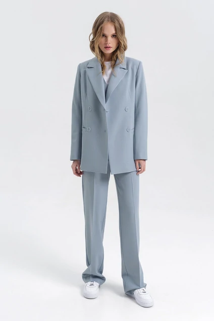 Текстильный костюм-двойка из двубортного жакета свободного покроя и прямых брюк с высокой посадкой. Детали: жакет прямого силуэта, пиджачный воротник, прорезные карманы, спинка со средним швом, втачные двухшовные рукава, жакет на подкладке. Брюки на притачном поясе со шлевками, передние половины с небольшими мягкими складками и заутюженными стрелками, застежка на молнию и пуговицу, боковые карманы