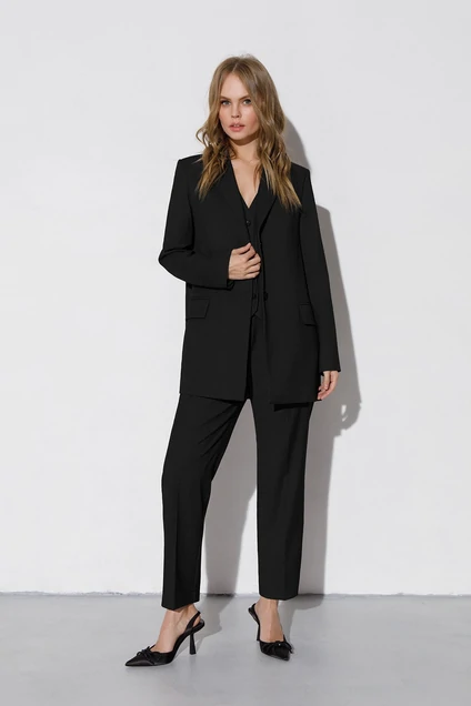 Текстильный костюм-тройка из трапециевидного жакета, полуприлегающего жилета и укороченных брюк со стрелками. Детали: жакет свободного покроя, пиджачный воротник, талиевые вытачки, функциональный нагрудный карман, прорезные карманы с клапанами, застежка на пуговицы, спинка со средним швом и высокой шлицей, рукава втачные двухшовные, жакет на подкладке. Жилет полуприлегающего силуэта, талиевые вытачками, застежка на петли и пуговицы, функциональные карманы, фигурный низ, на подкладке. Брюки с высокой посадкой на притачном поясе со шлевками, передние половины с небольшими застроченными мягкими складками и заутюженными стрелками, застежка на молнию и пуговицу, боковые карманы
