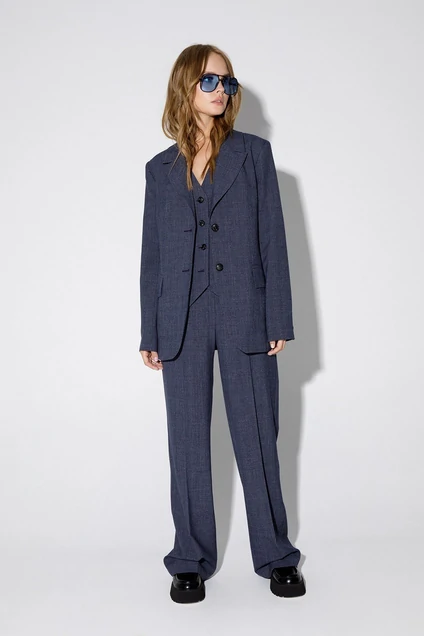 Костюм-тройка из полуприлегающего жакета со шлицами, жилета и широких брюк из текстильной ткани в клетку. Детали: пиджачный воротник, талиевые вытачки, перед с функциональным нагрудным карманом и двумя прорезными карманами, застежка на пуговицы, спинка со средним швом и шлицей, рукава втачные двухшовные со шлицами по низу, жакет на подкладке. Жилет полуприлегающего силуэта, талиевые вытачками, застежка на петли и пуговицы, функциональные карманы, фигурный низ, на подкладке. Брюки с высокой посадкой на притачном поясе со шлевками, передние половины с небольшими застроченными мягкими складками и заутюженными стрелками, застежка на молнию и пуговицу, боковые карманы