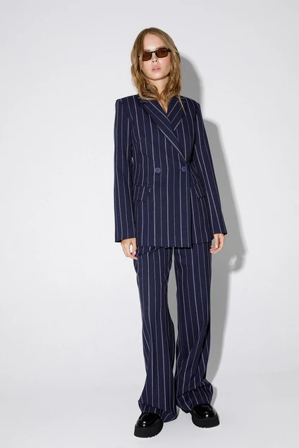 Костюм-тройка из двубортного полуприлегающего жакета, жилета и прямых брюк со стрелками из текстильной ткани в контрастную полоску. Детали: жакет с отрезными бочками и нагрудными вытачками, пиджачный воротник, прорезные карманы, застежка на петли и пуговицы, спинка со средним швом, втачные двухшовные рукава, жакет на подкладке. Жилет полуприлегающего силуэта, талиевые вытачками, застежка на петли и пуговицы, функциональные карманы, фигурный низ, на подкладке. Брюки с высокой посадкой на притачном поясе со шлевками, передние половины с небольшими застроченными мягкими складками и заутюженными стрелками, застежка на молнию и пуговицу, боковые карманы
