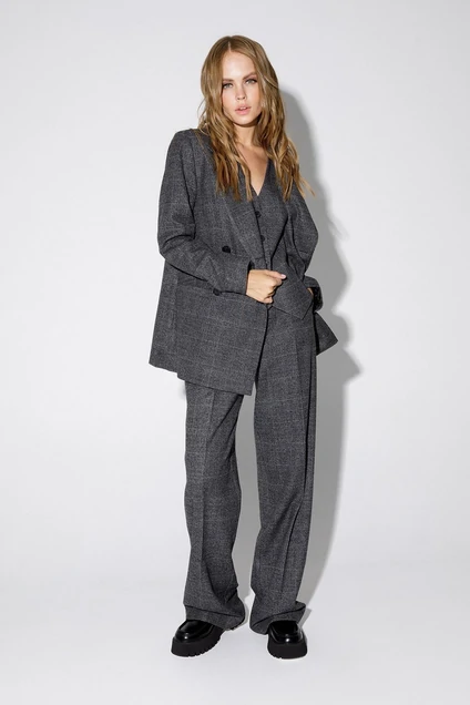 Костюм-тройка из двубортного жакета свободного покроя, жилета и широких прямых брюк со стрелками из текстильной ткани в клетку. Детали: жакет прямого силуэта, пиджачный воротник, прорезные карманы, спинка со средним швом, втачные двухшовные рукава, жакет на подкладке. Жилет полуприлегающего силуэта, талиевые вытачками, застежка на петли и пуговицы, функциональные карманы, фигурный низ, на подкладке. Брюки с высокой посадкой на притачном поясе со шлевками, передние половины с небольшими застроченными мягкими складками и заутюженными стрелками, застежка на молнию и пуговицу, боковые карманы