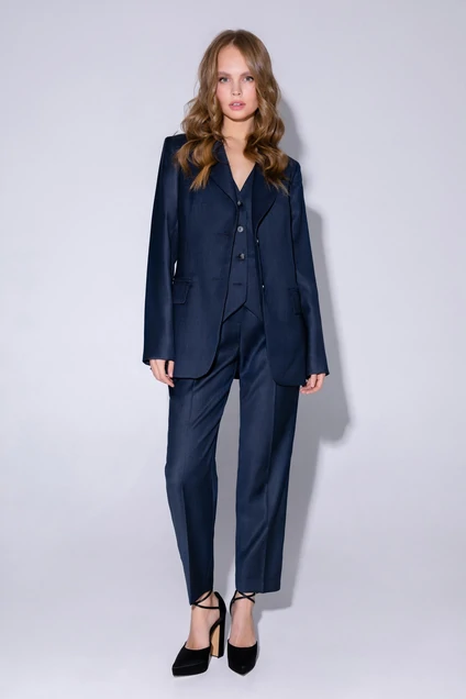 Костюм из полуприлегающего жакета со шлицами, жилета и укороченных брюк. Детали: пиджачный воротник, талиевые вытачки, перед с функциональным нагрудным карманом и двумя прорезными карманами, застежка на пуговицы, спинка со средним швом и шлицей, рукава втачные двухшовные со шлицами по низу, жакет на подкладке. Жилет полуприлегающего силуэта, талиевые вытачками, застежка на петли и пуговицы, функциональные карманы, фигурный низ, на подкладке. Брюки с высокой посадкой на притачном поясе со шлевками, застежка на молнию и пуговицу, боковые карманы, передние половины с заутюженными стрелками и двумя небольшими складками.