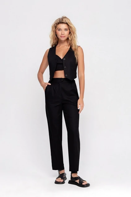 Льняной костюм-двойка из укороченного жилета и брюк со складками