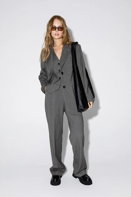 Текстильный костюм-тройка из свободного жакета, полуприлегающего жилета и прямых брюк со стрелками из текстильной ткани с рисунком «ёлочка». Детали: жакет с расширенной линией плеча, полуприлегающий силуэт, пиджачный воротник, талевые вытачки, перед с функциональным нагрудным карманом и двумя прорезными карманами с клапанами, застежка на пуговицы, спинка со средним швом, рукава втачные двухшовные, жакет на подкладке. Жилет с талевыми вытачками, застежка на петли и пуговицы, функциональные карманы, фигурный низ, на подкладке. Брюки с высокой посадкой на притачном поясе со шлевками, застежка на молнию и пуговицу, боковые карманы, передние половины с заутюженными стрелками и двумя небольшими складками