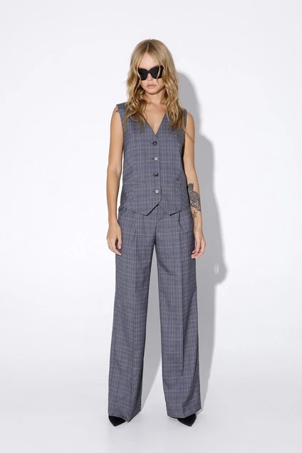 Текстильный костюм-двойка в клетку из полуприлегающего жилета и прямых брюк-палаццо со стрелками. Детали: жилет полуприлегающего силуэта, фигурный низ, талиевые вытачки, застежка на петли и пуговицы, функциональные карманы, на подкладке. Брюки с высокой посадкой на притачном поясе со шлевками, застежка на молнию и пуговицу, боковые карманы, передние половины с заутюженными стрелками и двумя небольшими складками.
