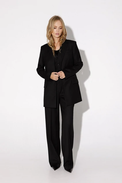 Текстильный костюм-тройка из трапециевидного жакета с высокой шлицей по спинке, полуприлегающего жилета и прямых брюк со стрелками. Детали: свободный покрой, пиджачный воротник, талиевые вытачки, функциональный нагрудный карман, прорезные карманы с клапанами, застежка на пуговицы, спинка со средним швом и высокой шлицей, рукава втачные двухшовные, жакет на подкладке. Жилет полуприлегающего силуэта, талиевые вытачками, застежка на петли и пуговицы, функциональные карманы, фигурный низ, на подкладке. Брюки с высокой посадкой на притачном поясе со шлевками, передние половины с небольшими застроченными мягкими складками и заутюженными стрелками, застежка на молнию и пуговицу, боковые карманы.