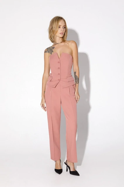 Текстильный костюм-двойка из топа-корсета и укороченных брюк со стрелками. Детали: топ-корсет прилегающего силуэта, рельефные швы с регилином, функциональные карманы, застежка по переду на петли и пуговицы, спинка с эластичной вставкой, фигурный низ. Брюки с высокой посадкой на притачном поясе со шлевками, передние половины с небольшими застроченными мягкими складками и заутюженными стрелками, застежка на молнию и пуговицу, боковые карманы.