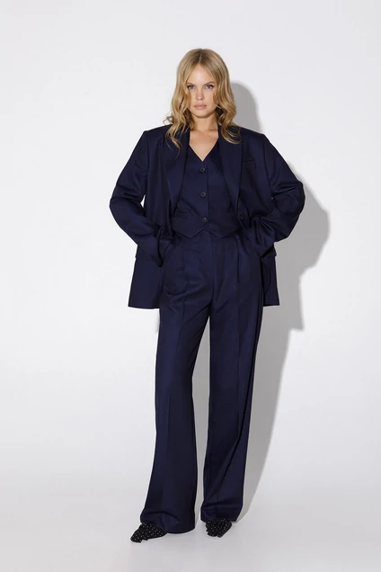 Костюм-тройка из оверсайз жакета, укороченного жилета и прямых брюк-палаццо со стрелками из костюмной ткани в горошек. Детали: жакет прямого силуэта, расширенная линия плеч, пиджачный воротник, перед с прорезными функциональными карманами, однобортная застежка на петли и пуговицы, спинка со средним швом и шлицей, рукава втачные двухшовные, жакет на подкладке. Жилет прямого силуэта с фигурным низом, талиевые вытачки, застежка на петли и пуговицы, функциональные карманы, на подкладке. Брюки с высокой посадкой на притачном поясе со шлевками, застежка на молнию и пуговицу, боковые карманы, передние половины с заутюженными стрелками и двумя небольшими складками.