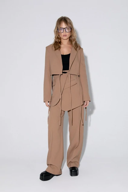 Комплект- тройка из свободного жакета с отделкой, базовой трикотажной майки и брюк-палаццо со стрелками. Детали: жакет прямого силуэта, пиджачный воротник, талиевые вытачки, прорезные карманы с клапанами, спинка со средним швом, рукава втачные двухшовные, жакет на подкладке. Майка из трикотажа- «лапша», глубокие вырезы горловины и пройм. Брюки с высокой посадкой на притачном поясе со шлевками, застежка на молнию и пуговицу, боковые карманы, передние половины с заутюженными стрелками и двумя небольшими складками.