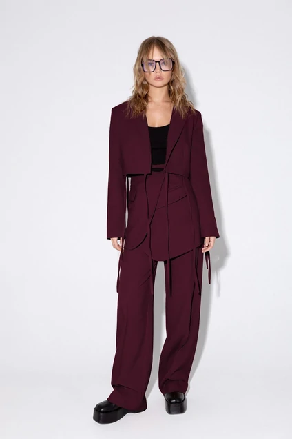 Комплект- тройка из свободного жакета с отделкой, базовой трикотажной майки и брюк-палаццо со стрелками. Детали: жакет прямого силуэта, пиджачный воротник, талиевые вытачки, прорезные карманы с клапанами, спинка со средним швом, рукава втачные двухшовные, жакет на подкладке. Майка из трикотажа- «лапша», глубокие вырезы горловины и пройм. Брюки с высокой посадкой на притачном поясе со шлевками, застежка на молнию и пуговицу, боковые карманы, передние половины с заутюженными стрелками и двумя небольшими складками.