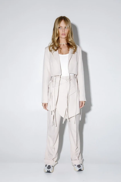 Комплект- тройка из свободного жакета с отделкой, базовой трикотажной майки и брюк-палаццо со стрелками. Детали: жакет прямого силуэта, пиджачный воротник, талиевые вытачки, прорезные карманы с клапанами, спинка со средним швом, рукава втачные двухшовные, жакет на подкладке. Майка из трикотажа- «лапша», глубокие вырезы горловины и пройм. Брюки с высокой посадкой на притачном поясе со шлевками, застежка на молнию и пуговицу, боковые карманы, передние половины с заутюженными стрелками и двумя небольшими складками.