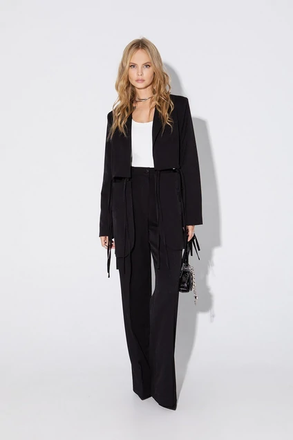 Комплект- тройка из свободного жакета с отделкой, базовой трикотажной майки и брюк-палаццо со стрелками. Детали: жакет прямого силуэта, пиджачный воротник, талиевые вытачки, прорезные карманы с клапанами, спинка со средним швом, рукава втачные двухшовные, жакет на подкладке. Майка из трикотажа- «лапша», глубокие вырезы горловины и пройм. Брюки с высокой посадкой на притачном поясе со шлевками, застежка на молнию и пуговицу, боковые карманы, передние половины с заутюженными стрелками и двумя небольшими складками.