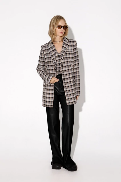 Комплект-тройка из трапециевидного жакета свободного покроя, укороченного жилета и прямых брюк из экокожи. Детали: пиджачный воротник, талиевые вытачки, перед с функциональным нагрудным и двумя прорезными карманами, застежка на пуговицы, спинка со средним швом и высокой шлицей, рукава втачные двухшовные, жакет на подкладке. Жилет прямого силуэта с фигурным низом, талиевые вытачки, застежка на петли и пуговицы, функциональные карманы, на подкладке. Брюки с высокой посадкой, прилегающий силуэт, притачной пояс со шлевками, застежка на молнию и пуговицу, перед с боковыми карманами, спинка с кокеткой и двумя накладными карманами, разрезы по низу боковых швов. Изнанка экокожи с небольшим ворсом.