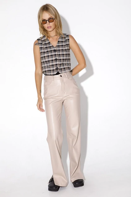 Комплект-двойка из укороченного жилета в клетку и прямых брюк из экокожи. Детали: жилет прямого силуэта с фигурным низом, талиевые вытачки, застежка на петли и пуговицы, функциональные карманы, на подкладке. Брюки с высокой посадкой, прилегающий силуэт, притачной пояс со шлевками, застежка на молнию и пуговицу, перед с боковыми карманами, спинка с кокеткой и двумя накладными карманами, разрезы по низу боковых швов. Изнанка экокожи с небольшим ворсом.