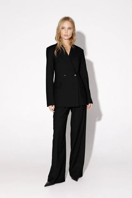 Текстильный костюм-тройка из двубортного полуприлегающего жакета, жилета и прямых брюк со стрелками. Детали: жакет с отрезными бочками и нагрудными вытачками, пиджачный воротник, прорезные карманы, застежка на петли и пуговицы, спинка со средним швом, втачные двухшовные рукава, жакет на подкладке. Жилет полуприлегающего силуэта, талиевые вытачками, застежка на петли и пуговицы, функциональные карманы, фигурный низ, на подкладке. Брюки с высокой посадкой на притачном поясе со шлевками, передние половины с небольшими застроченными мягкими складками и заутюженными стрелками, застежка на молнию и пуговицу, боковые карманы.