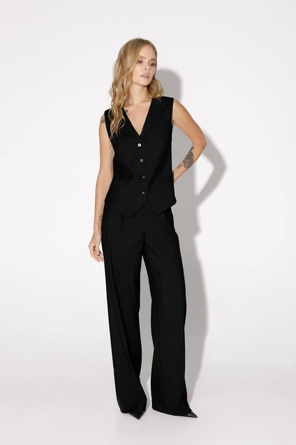 Текстильный костюм-двойка из полуприлегающего жилета и прямых брюк со стрелками. Детали: жилет полуприлегающего силуэта, талиевые вытачками, застежка на петли и пуговицы, функциональные карманы, фигурный низ, на подкладке. Брюки с высокой посадкой на притачном поясе со шлевками, передние половины с небольшими застроченными мягкими складками и заутюженными стрелками, застежка на молнию и пуговицу, боковые карманы.