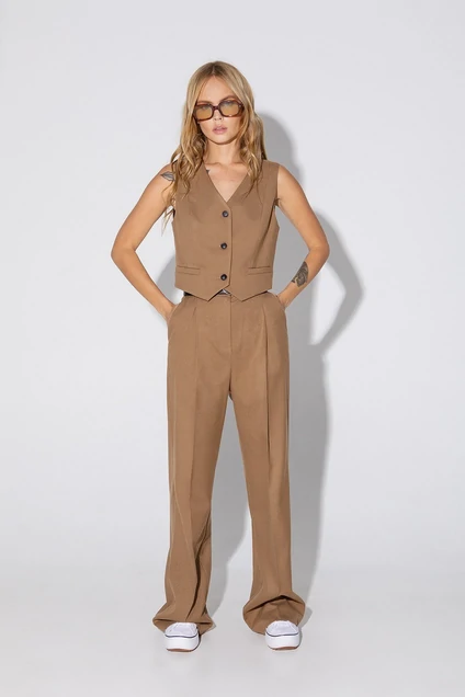 Текстильный костюм-двойка из укороченного жилета и прямых брюк-палаццо со стрелками. Детали: жилет прямого силуэта с фигурным низом, талиевые вытачки, застежка на петли и пуговицы, функциональные карманы, на подкладке. Брюки с высокой посадкой на притачном поясе со шлевками, застежка на молнию и пуговицу, боковые карманы, передние половины с заутюженными стрелками и двумя небольшими складками.
