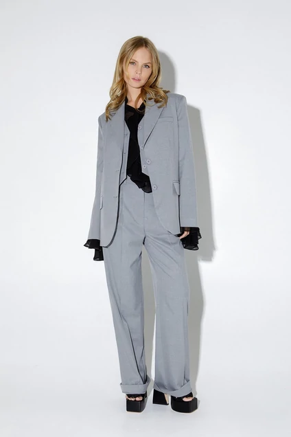 Костюм-тройка из оверсайз жакета, укороченного жилета и прямых широких брюк со стрелками из текстильной ткани. Детали: жакет прямого силуэта, расширенная линия плеч, пиджачный воротник, перед с прорезными функциональными карманами, однобортная застежка на петли и пуговицы, спинка со средним швом и шлицей, рукава втачные двухшовные, жакет на подкладке. Жилет прямого силуэта с фигурным низом, талиевые вытачки, застежка на петли и пуговицы, функциональные карманы, на подкладке. Брюки с высокой посадкой на притачном поясе со шлевками, пояс прямой без резинки, застежка на молнию и пуговицу, боковые карманы, передние половины с заутюженными стрелками и двумя небольшими складками. Задние части брюк с вытачками и заутюженными стрелками.
