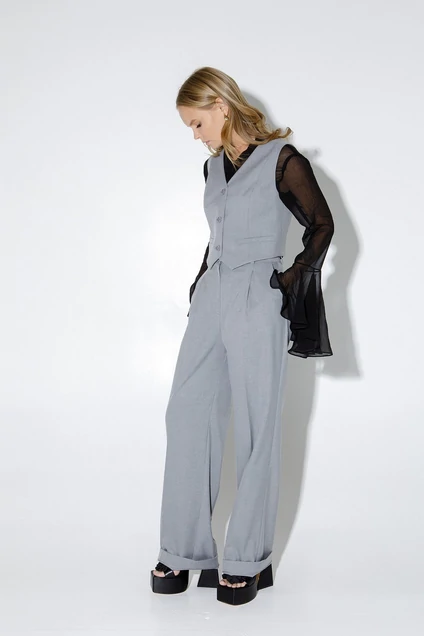 Костюм-двойка из укороченного жилета и прямых широких брюк со стрелками из текстильной ткани. Детали: жилет прямого силуэта с фигурным низом, талиевые вытачки, застежка на петли и пуговицы, функциональные карманы, на подкладке. Брюки с высокой посадкой на притачном поясе со шлевками, пояс прямой без резинки, застежка на молнию и пуговицу, боковые карманы, передние половины с заутюженными стрелками и двумя небольшими складками. Задние части брюк с вытачками и заутюженными стрелками.