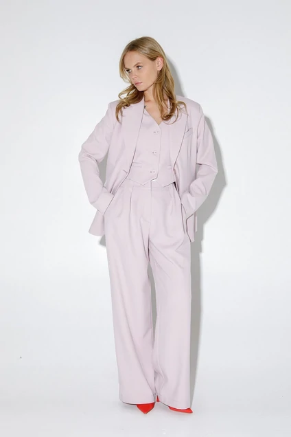 Текстильный костюм-тройка из оверсайз жакета, укороченного жилета и широких брюк-палаццо со складками- шлевками. Детали: жакет прямого силуэта, расширенная линия плеч, пиджачный воротник, перед с прорезными функциональными карманами, однобортная застежка на петли и пуговицы, спинка со средним швом и шлицей, рукава втачные двухшовные, жакет на подкладке. Жилет прямого силуэта с фигурным низом, талиевые вытачки, застежка на петли и пуговицы, функциональные карманы, на подкладке. Брюки на притачном поясе, застежка на молнию и брючный крючок, боковые карманы. Задние части брюк с вытачками и имитацией кармана.