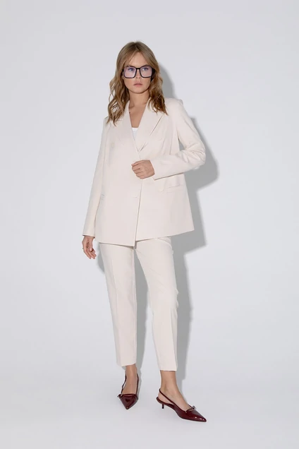 Детали: жакет прямого силуэта, пиджачный воротник, перед с прорезными карманами, двубортная застежка на петли и пуговицы, спинка со средним швом, рукава втачные двухшовные, жакет на подкладке. Майка из трикотажа «лапша» прилегающего силуэта, глубокие вырезы горловины и пройм. Брюки со средней посадкой, притачной пояс со шлевками, передние половины с небольшими мягкими складками и заутюженными стрелками, застежка на молнию и пуговицу, боковые карманы.