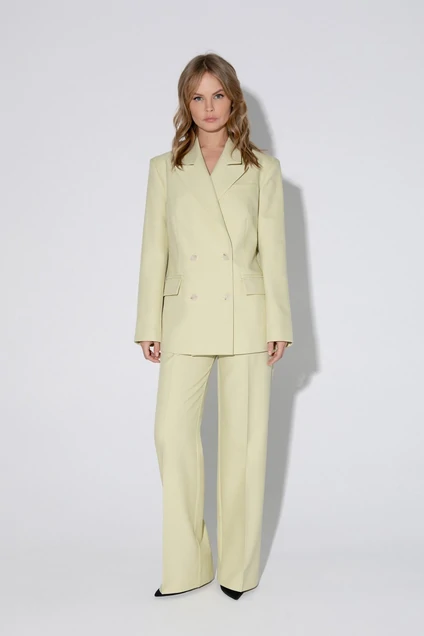 Текстильный костюм-двойка из свободного жакета и прямых брюк со стрелками.
