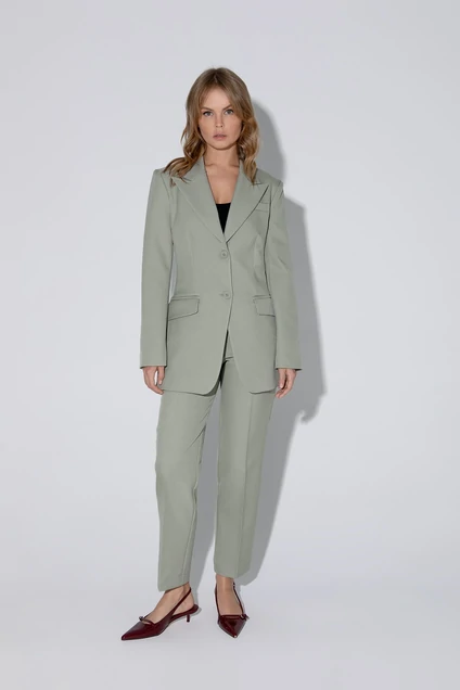 Детали: жакет прилегающего силуэта, талиевые вытачки, отрезные бочки, застежка на петли и пуговицы, пиджачный воротник, функциональные карманы, жакет на подкладке. Брюки с высокой посадкой на притачном поясе со шлевками, передние половины с небольшими застроченными мягкими складками и заутюженными стрелками, застежка на молнию и пуговицу, боковые карманы. Задние части брюк с вытачками и имитацией карманов.