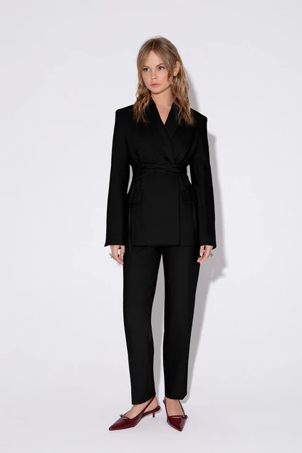 Текстильный костюм-двойка из жакета со шнуровкой с расширенной линией плеч и классических укороченный брюк со стрелками.