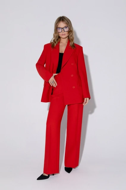 Детали: жакет свободного покроя и полуприлегающего силуэта, двубортная застежка на петли и пуговицы, отрезные бочки, пиджачный воротник, функциональные карманы, жакет на подкладке. Брюки с высокой посадкой, притачной пояс со шлевками, передние половины с небольшими застроченными мягкими складками и заутюженными стрелками, застежка на молнию и пуговицу, боковые карманы. Задние части брюк с вытачками и заутюженными стрелками. Пояс брюк прямой, без резинки.
