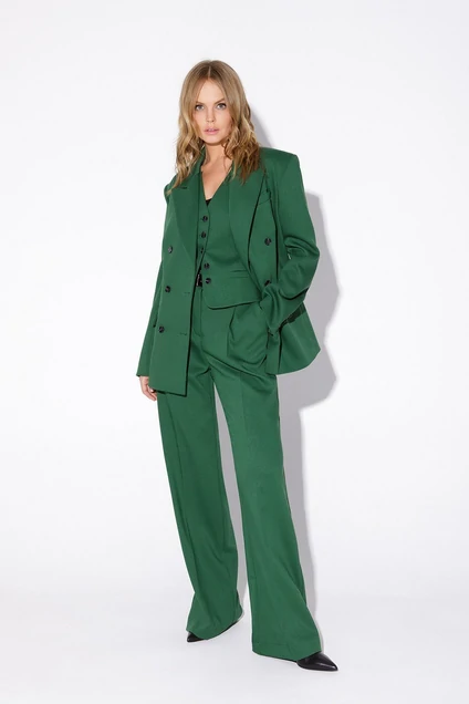 Детали: жакет свободного покроя и полуприлегающего силуэта, двубортная застежка на петли и пуговицы, отрезные бочки, пиджачный воротник, функциональные карманы, жакет на подкладке. Жилет с талиевыми вытачками, спинка со средним швом и рельефами, застежка на петли и пуговицы, функциональные карманы, на подкладке, прилегание по талии регулируется хлястиками на спинке. Брюки с высокой посадкой, притачной пояс со шлевками, передние половины с небольшими застроченными мягкими складками и заутюженными стрелками, застежка на молнию и пуговицу, боковые карманы. Задние части брюк с вытачками и заутюженными стрелками. Пояс брюк прямой, без резинки.