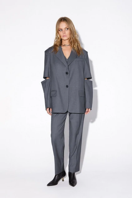 Текстильный костюм-двойка из оверсайз жакета с разрезами по рукавам и укороченных брюк со стрелками.