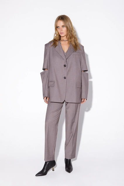 Текстильный костюм-двойка из оверсайз жакета с разрезами по рукавам и укороченных брюк со стрелками.