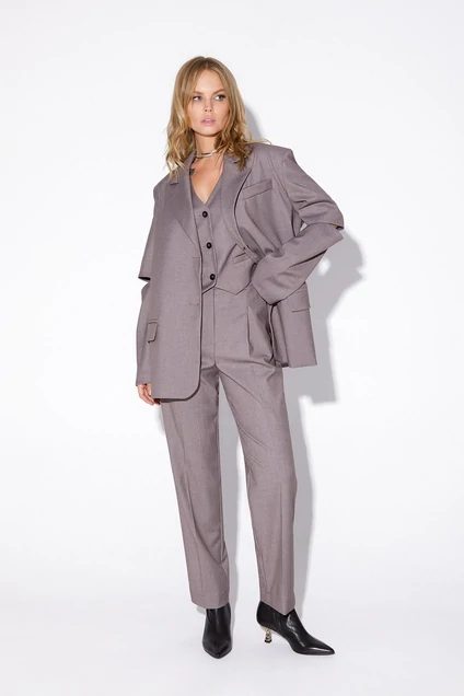 Текстильный костюм-тройка из оверсайз жакета с разрезами по рукавам, укороченного жилета и брюк со стрелками.