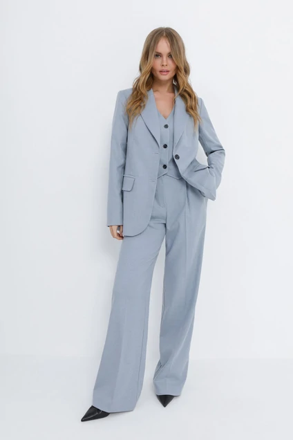 Текстильный костюм-тройка из свободного жакета со шлицами, укороченного жилета и прямых брюк-палаццо со стрелками. Детали: жакет полуприлегающего силуэта, талиевые вытачки, пиджачный воротник, застежка на две петли и пуговицы, функциональные карманы, рукава и спинка со шлицами, жакет на подкладке. Жилет прямого силуэта с фигурным низом, талиевые вытачки, застежка на петли и пуговицы, функциональные карманы, на подкладке. Брюки с высокой посадкой на притачном поясе со шлевками, застежка на молнию и пуговицу, боковые карманы, передние половины с заутюженными стрелками и двумя небольшими складками. Пояс брюк прямой, без резинки.