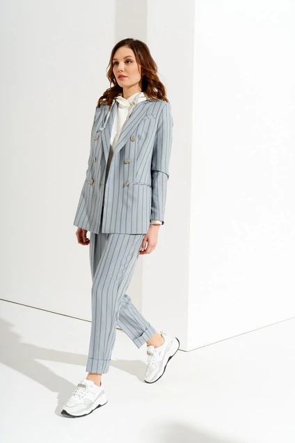 Двубортный жакет прямого кроя, спереди прорезные карманы. Воротник пиджачного типа. Брюки прямого силуэта, по бокам карманы. Застежка на молнию и потайные крючки.