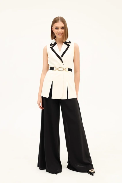 Элегантный комплект, состоящий из жилета и брюк палаццо. Жилет полуприлегающего силуэта на х/б подкладке с воротником пиджачного типа с контрастной окантовкой. Центральная застежка на потайные кнопки. Перед с рельефами, переходящими в разрезы в нижней части жилета. Струящиеся брюки-палаццо свободного силуэта с расклешением от бедра, на притачном поясе, с застёжкой на потайную молнию в боковом шве.