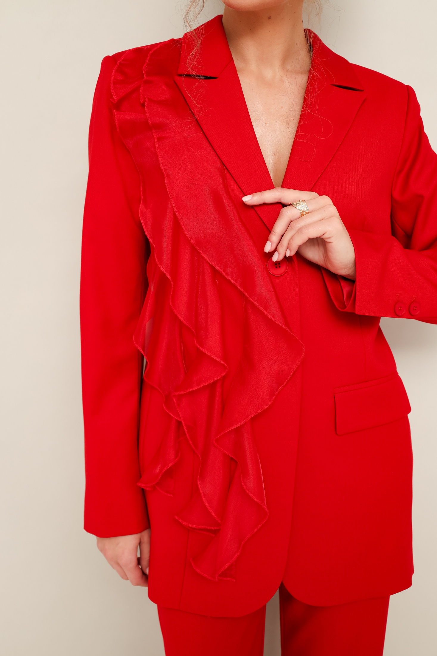 Жакет полуприлегающего силуэта, с центральной застежкой на петли и пуговицы. Воротник пиджачного типа с отложными лацканами, край борта скругленный по низу жакета. Спереди прорезной карман в рамку с клапаном. По правой полочке обработан декоративный элемент в виде настрочных воланов. Рукава втачные, двухшовные с вытачными шлицами с пуговицами. Спинка с рельефами и средним швом, переходящим в шлицу. Жакет на подкладке.