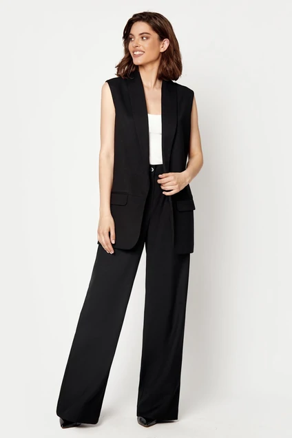 Костюм состоит из удлиненного жилета и брюк. Жилет прямого силуэта, без застежки. Воротник пиджачного типа. На передних полочках имитация кармана с клапаном в рамку. Брюки прямые, с центральной застежкой на пуговицу и молнию. В боковых швах карманы. длина изделия - 76 см, длина брюк- 113 см.