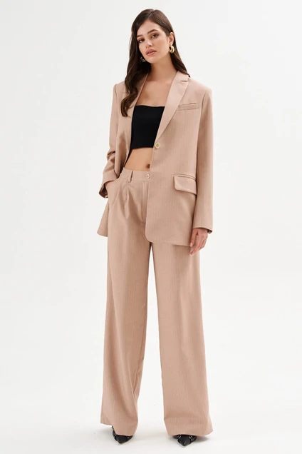 Костюм женский, состоящий из жакета и брюк. Жакет прямого силуэта, длиной ниже линии бедер. Спинка со средним швом, в котором есть высокая шлица. По переду карманы «в рамку» с клапаном. В области груди на левом переде есть карман-обманка с листочкой. Рукава длинные, двушовные, втачные. По низу рукава, в локтевом шве обработана шлица. Воротник пиджачного типа с лацканами. Застежка по переду на петлю и пуговицу. Жакет на подкладке.Брюки длинные, широкие. По задним половинкам талиевые вытачки. По передним половинкам односторонние складки, боковые карманы и застежка на тесьму-«молнию» с гульфиком и откоском. Брюки на притачном поясе, по спинке с резинкой. По поясу вставлены шлевки.