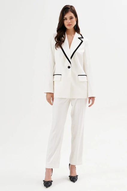 Костюм, состоящий из жакета и брюк. Жакет полуприлегающего силуэта, длиной ниже линии бедер. Спинка со средним швом и рельефами. В среднем шве шлица. Перед с талиевой вытачкой, рельефами и прорезными карманами «в рамку» с клапаном. Рукава длинные, двушовные, втачные. Воротник пиджачного типа с лацканами. Застежка однобортная на петлю и пуговицу. По воротнику, лацканам планки из отделочной ткани. Жакет на подкладке.Брюки длиной до щиколотки, зауженные к низу, на притачном поясе с частично вставленной резинкой. По задним половинкам талиевые вытачки и заутюжены стрелки. По передним половинкам заутюжены стрелки и обработаны карманы с наклонным входом. Застежка на тесьму-«молнию» с гульфиком и откоском.