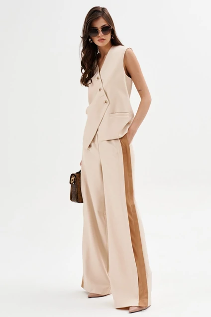 Костюм, состоящий из жилетки и брюк. Жилетка свободного кроя, длиной чуть выше линии бедер, с ассиметричной линией низа. Спинка с ассиметричным швом. Перед с прорезными карманами с листочкой. Застежка ассиметричная на петли и пуговицы. Жилетка на подкладке. Брюки прямого силуэта, на притачном поясе с резинкой по спинке. По задним половинкам талиевые вытачки, с правой стороны карман-обманка с листочкой. По передним половинкам односторонние складки. По боковым лампас из отделочной ткани. В боковых швах обработаны карманы, по низу шлица. Застежка на тесьму-«молнию» с гульфиком и откоском. По поясу застежка на петлю и пуговицу.
