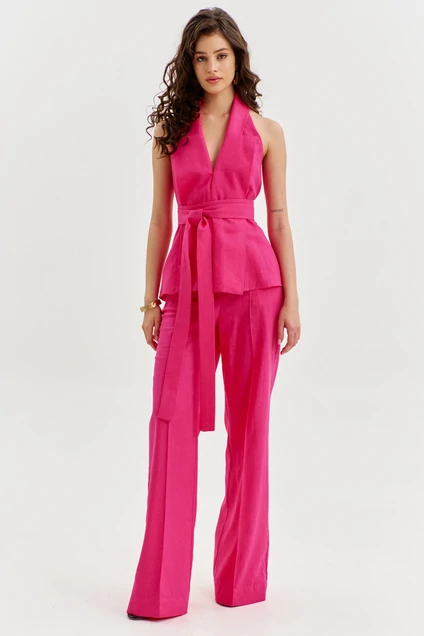 Комплект, состоящий из жилета и брюк. Жилет полуприлегающего силуэта с английской проймой. Длина жилета до середины бедер. Спинка со средним швом. Перед с рельефами от пройм до низа. Воротник пиджачного типа с лацканами до низа. Застежка на навесные петли и пуговицы. Жилет дополняет съемный пояс. Брюки прямого силуэта, на притачном поясе с резинкой по спинке. По задним половинкам талиевые вытачки и заутюжены стрелки. По передним половинкам застрочены стрелки и обработаны боковые карманы с наклонным входом, и застежка на тесьму-«молнию» с гульфиком и откоском. По поясу застежка на петлю и пуговицу.
