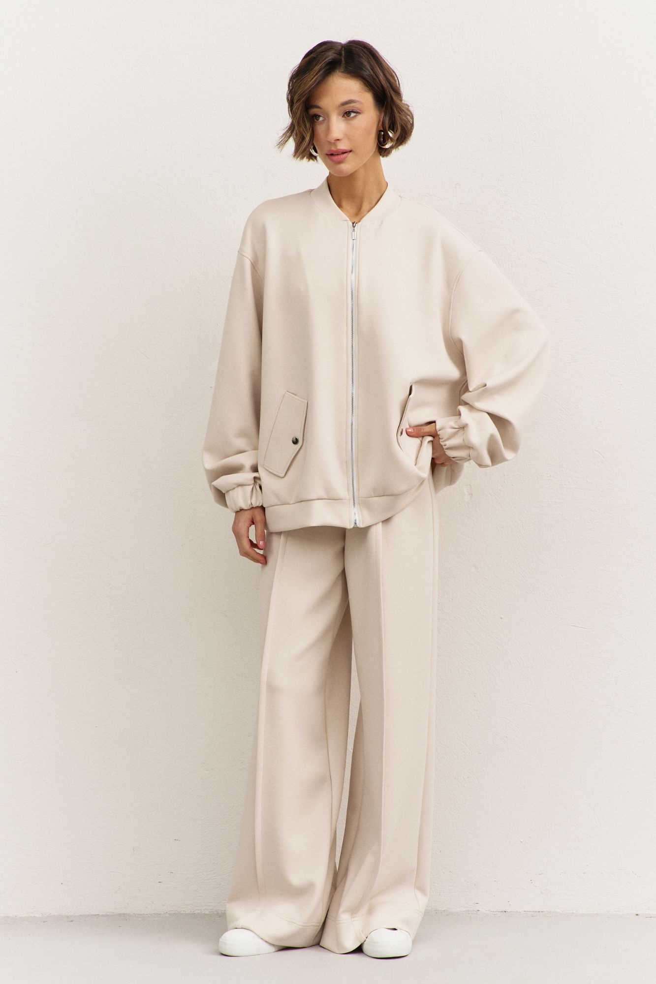 Костюм брючный 1487-1 RINKA от коллекции бренда RINKA сочетает в себе комфорт и стиль. Комплект из бомбера и брюк выполнен из приятного трикотажного материала, который включает 77% вискозы и добавки полиамида и спандекса, обеспечивая эластичность и мягкость. Свободный крой бомбера с застежкой на молнию, карманами с клапанами и втачными длинными рукавами делает его идеальным для повседневного и офисного стиля. Брюки с притачным поясом на резинке и декоративным кантом подчеркивают актуальность модели. Нейтральный бежевый цвет позволяет легко комбинировать костюм с другими элементами гардероба. Идеальный вариант для весенне-осеннего сезона.